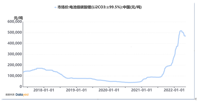 而在新能源車(chē)企涉足上游鋰礦資源的背后,則是近年來(lái)碳酸鋰價(jià)格的瘋狂上漲。通聯(lián)數(shù)據(jù)Datayes!的統(tǒng)計(jì)顯示,2021年1月份時(shí),電池級(jí)碳酸鋰的價(jià)格僅為5.3萬(wàn)元/噸,到2022年3月份,達(dá)到驚人的51.65萬(wàn)元/噸,漲幅接近10倍;即使4月份開(kāi)始有所回調(diào),但截至5月10日,仍高達(dá)46.9萬(wàn)元/噸,近一年的漲幅為420%。