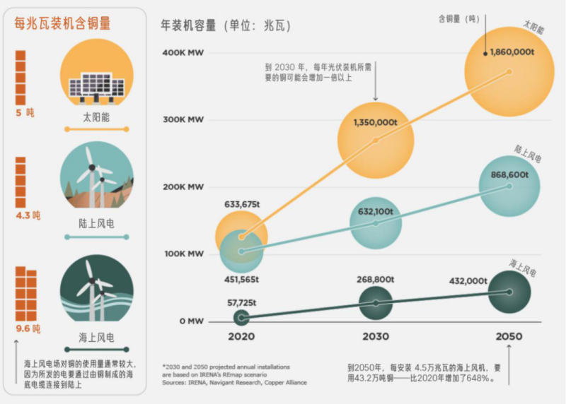 銅有著極佳的導(dǎo)熱性和導(dǎo)電性,因此是能源技術(shù)中使用最廣泛的礦物,對所有與電力相關(guān)的基礎(chǔ)設(shè)施都至關(guān)重要。根據(jù) Navigant Research 的數(shù)據(jù),以下是風(fēng)能和太陽能發(fā)電場每兆瓦裝機(jī)使用的銅量: