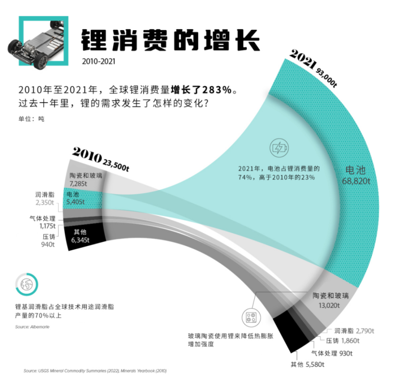 由于鋰在清潔能源技術(shù)中的應(yīng)用,自2010年以來,鋰的消費量幾乎增長了4倍。不但需求增加了,用途也發(fā)生了變化。以往鋰最大的用途是陶瓷和玻璃制造業(yè)。在陶瓷和玻璃器皿的涂層中添加碳酸鋰可以減少熱膨脹,這對于現(xiàn)代玻璃陶瓷灶具來說是必不可少的。但在這十年間,電動汽車發(fā)展迅速,占全球汽車市場份額從2010年的0.01%飆升至2021年的8.6%。這對電池產(chǎn)生了巨大的需求,目前電池用鋰占全球鋰消費量的近四分之三。隨著電動汽車的普及,本世紀(jì)20年代或許是標(biāo)志著鋰消費增長的又一個十年。多個國家已經(jīng)承諾到2030年逐步淘汰內(nèi)燃機(jī)汽車,大眾、通用和福特等大型汽車制造商都在計劃推出新的電動汽車。鋰的消耗量預(yù)計會持續(xù)增加,到2025年,電池消耗的鋰將占鋰總產(chǎn)量的84%。