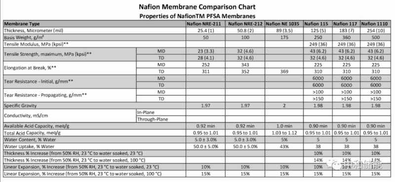 以美國杜邦公司生產(chǎn)的全氟磺酸質(zhì)子交換膜Nafion?系列膜(Nafion? 112、Nafion? 115、Nafion? 117等)為例,在中國售賣的產(chǎn)品N115和N117,其少量零售價分別為13500元/平方米和15000-19000元/平方米,批量售價也在2000-3000元/平方米。據(jù)其公開資料顯示,Nafion全氟磺酸 (PFSA) 膜是PFSA/聚四氟乙烯 (PTFE) 共聚物膜,其用于儲能方面的膜主要包括采用流延法生產(chǎn)的具有高穩(wěn)定性的NR211和NR212,其厚度分別為25.4微米和50.8微米,以及擠出法生產(chǎn)的高穩(wěn)定性的N115和N117,其厚度分別為125微米和183微米,其主要性能如下所示。在表中顯示的相關(guān)產(chǎn)品性能,NR211、NR212、N115、N117的機械方向(MD)拉伸強度分別為23MPa,32MPa,43MPa和43MPa,隨著厚度提升其拉伸強度隨之提升。相關(guān)文獻報道目前其主要電導率參數(shù)N117為0.035 S cm?1,其它Nafion的性能也在0.05-0.07 S cm?1左右,隨厚度減小而逐漸電導率增加。