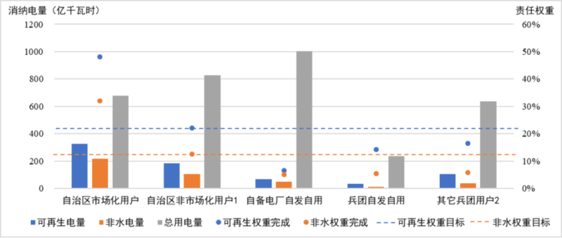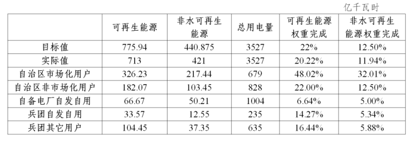 1.公網(wǎng)非市場化用戶。根據(jù)消納保障機(jī)制,對于電網(wǎng)企業(yè)按照可再生能源發(fā)電保障性收購要求統(tǒng)一收購可再生能源電量對應(yīng)的消納量,首先用于完成居民、農(nóng)業(yè)、重要公用事業(yè)和公益性服務(wù)、非市場化用電量對應(yīng)消納責(zé)任權(quán)重任務(wù)。如有剩余,電網(wǎng)企業(yè)按照各省級政府出臺的可再生能源電力消納保障實施方案,向各市場主體分配剩余的保障性收購電量。雖然新疆未公布非市場化用戶消納完成情況,但根據(jù)上述規(guī)定推斷,非市場化用戶優(yōu)先完成了22%和12.5%責(zé)任權(quán)重目標(biāo)。