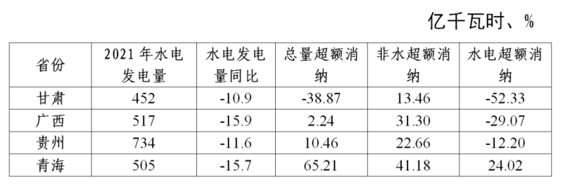 值得注意的是,2021年全國水電發(fā)電量是近十年來第一次出現(xiàn)負(fù)增長,全國包括甘肅在內(nèi)共有14個省份負(fù)增長。根據(jù)中電聯(lián)《2021-2022年度全國電力供需形勢分析預(yù)測報告》,2021年受汛期主要流域降水偏少等因素影響,全國規(guī)模以上工業(yè)企業(yè)水電發(fā)電量同比下降2.5%。將與甘肅2021年水電發(fā)電量總量及增速相近的三個省份做對比可以發(fā)現(xiàn)(表1),廣西、貴州的水電超額消納量均為負(fù),主要通過超額完成非水電可再生能源消納電量來實現(xiàn)總量責(zé)任權(quán)重目標(biāo)。青海非水和水電均超額完成,通過測算,非水的超額完成為水電目標(biāo)創(chuàng)造了65億千瓦時的彈性空間,也就是說,即便青海水電超額消納量為0、甚至為-41億千瓦時,依然可以超額或剛好完成總量責(zé)任權(quán)重目標(biāo)。