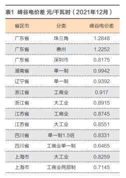 2021年7月,國(guó)家發(fā)展改革委發(fā)布《關(guān)于進(jìn)一步完善分時(shí)電價(jià)機(jī)制的通知》,全國(guó)各?。ㄊ校┌凑找螅贫恕胺謺r(shí)峰谷電價(jià)”。從表1中可知,各地一般工商業(yè)用電的峰谷電價(jià)差,少的每千瓦時(shí)0.6元,多的每千瓦時(shí)1.2元。由此可見,儲(chǔ)能蓄能設(shè)施具有較大的套利空間。