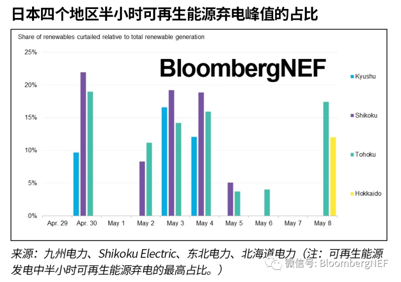 由于高電力供應(yīng)適逢低需求,日本可再生能源發(fā)電的棄電頻率在春季會更高。在4月下旬至5月初的假日期間,日本四個地區(qū)出現(xiàn)棄電。Shikoku Electric Transmission and Distribution Co.不得不在4月30日丟棄半小時可再生能源發(fā)電量的22%,創(chuàng)下該地區(qū)有史以來的最高水平。