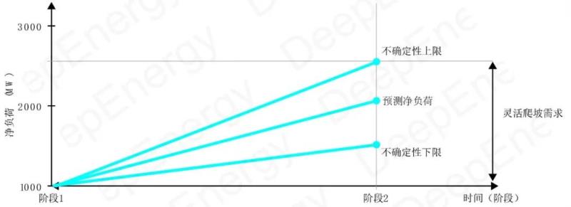 FRP是一種輔助服務(wù)并且常有兩個(gè)獨(dú)立的產(chǎn)品,一個(gè)是爬坡調(diào)節(jié),叫做靈活爬坡(FRU),另一種是降坡調(diào)節(jié),叫做靈活降坡(FRD)。這種產(chǎn)品可以綜合需求和VRE的調(diào)節(jié)要求,將凈負(fù)荷偏差考慮進(jìn)來(lái),然后反映出調(diào)節(jié)預(yù)測(cè)的不確定性。在預(yù)測(cè)上,像電網(wǎng)系統(tǒng)其他備用要求一樣,F(xiàn)RP試圖將需求和VRE的預(yù)測(cè)偏差考慮進(jìn)來(lái)。圖3給出了一個(gè)示例,在給定凈負(fù)荷曲線和預(yù)測(cè)不確定度時(shí),F(xiàn)RP的調(diào)節(jié)要求是怎樣的。
