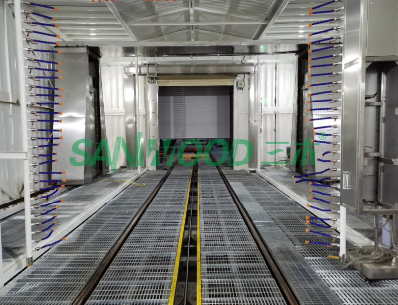 集裝箱頂部與左右兩側(cè)采用行車(chē)固定自動(dòng)噴淋系統(tǒng),前后側(cè)采用龍門(mén)支架,噴頭可左右移動(dòng)。