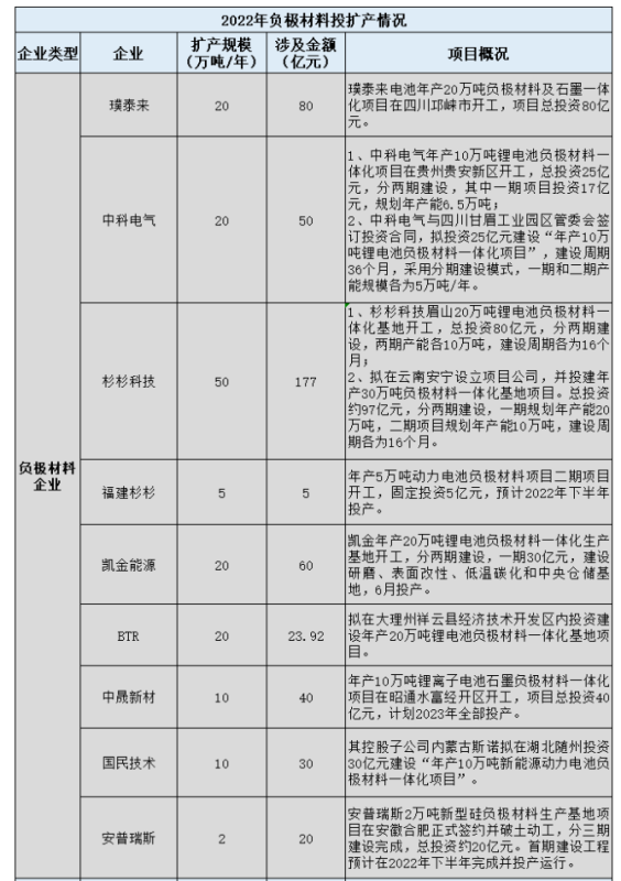 據(jù)高工鋰電不完全統(tǒng)計(jì),2022年開(kāi)年以來(lái)至今,負(fù)極材料投擴(kuò)產(chǎn)項(xiàng)目29個(gè),涉及規(guī)模400.6萬(wàn)噸,金額達(dá)885.12億元。