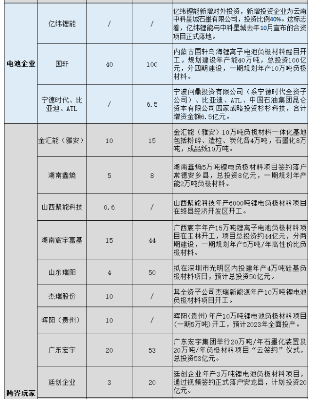 在此情境下,寧德時(shí)代、億緯鋰能等動(dòng)力電池布防負(fù)極材料,有利于維穩(wěn)自身供應(yīng)鏈,提高成本議價(jià)權(quán);杉杉股份、中科電氣等負(fù)極材料相關(guān)企業(yè)加碼,則有利于提高自身生產(chǎn)能力,形成規(guī)?;?yīng);索通發(fā)展、君禾股份等新玩家入局,則可打造新的業(yè)績(jī)?cè)鲩L(zhǎng)曲線。