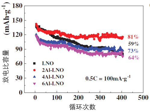 與未摻雜材料相比,適宜濃度的鋁摻雜材料在0.5C電流密度測(cè)試時(shí),循環(huán)400次的容量保持率從59%提升到81%。