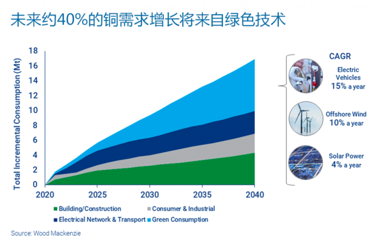 銅的使用基于其延展性、傳熱性和抗菌特性。加之良好的導電性能,我們預(yù)計,未來40%的需求增長將來自綠色技術(shù)中的電力應(yīng)用,包括電動汽車、海上風電和光伏設(shè)備。