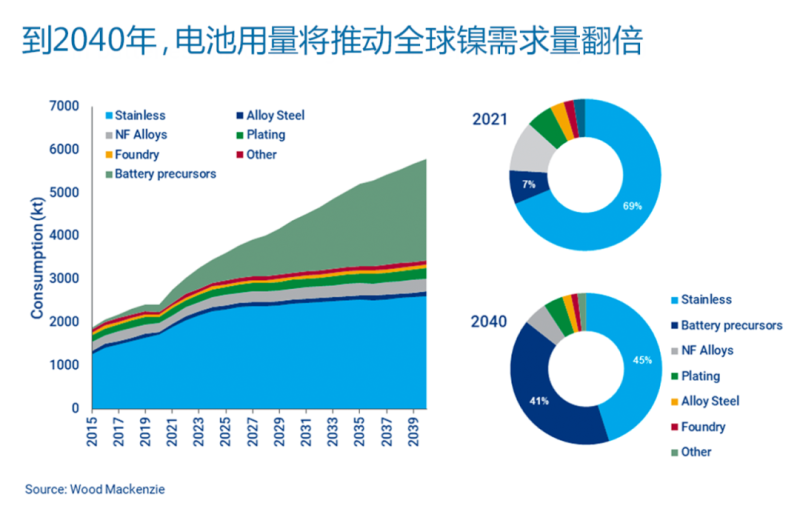 雖然不銹鋼仍將是鎳的主要用途,但未來20年需求增長的主要來源將是電池。伍德麥肯茲預(yù)計,至2040年,鎳需求量將翻一番,達到每年600萬噸。其中,電池鎳用量占總用量的占比將從2021年的7%增長到2040年的40%。