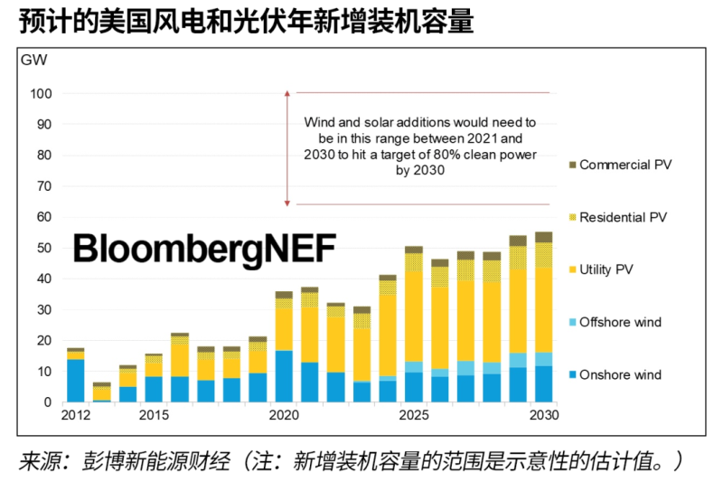 中國儲(chǔ)能網(wǎng)訊:美國總統(tǒng)喬·拜登提出到2030年實(shí)現(xiàn)清潔電力占比80%的目標(biāo),而彭博新能源財(cái)經(jīng)的一份報(bào)告發(fā)現(xiàn),2022年至2030年期間美國新增的風(fēng)電和光伏裝機(jī)容量不足以滿足這一愿景。短期瓶頸是供應(yīng)鏈和關(guān)稅不確定性。長期而言,老舊的電網(wǎng)基礎(chǔ)設(shè)施和繁文縟節(jié)將阻礙可再生能源裝機(jī)容量的進(jìn)一步擴(kuò)大。
