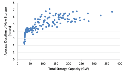 圖14.儲(chǔ)能系統(tǒng)部署的平均持續(xù)時(shí)間隨著儲(chǔ)能系統(tǒng)總裝機(jī)容量的增加而增加,最高可達(dá)約200GW。