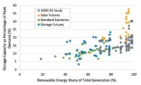 圖11. 儲(chǔ)能系統(tǒng)容量作為可再生能源貢獻(xiàn)的函數(shù)(%)。