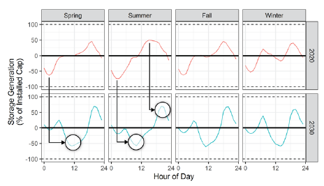 圖9說(shuō)明了隨著太陽(yáng)能發(fā)電設(shè)施裝機(jī)容量的增加,儲(chǔ)能系統(tǒng)運(yùn)營(yíng)如何隨著凈負(fù)載的變化而變化。頂部曲線(xiàn)顯示了2020年模擬條件下的美國(guó)晝間儲(chǔ)能平均充放電的概況,其中儲(chǔ)能系統(tǒng)主要在夜間充電,這對(duì)應(yīng)于最低的凈負(fù)荷水平。底部面板顯示了2030年模擬條件的結(jié)果,其中部署的太陽(yáng)能發(fā)電設(shè)施大幅增加。儲(chǔ)能系統(tǒng)充電的時(shí)間大部分將轉(zhuǎn)移到中午,這與過(guò)剩的太陽(yáng)能發(fā)電量的可用性相吻合。