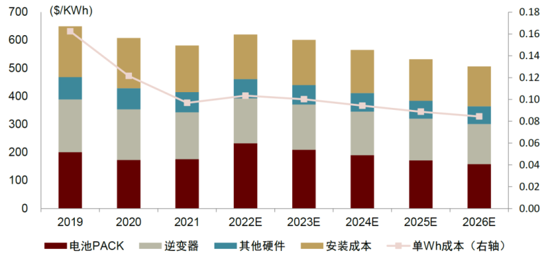 家庭儲(chǔ)能安裝成本下降提升其經(jīng)濟(jì)性。從成本拆解來看,2021年家庭儲(chǔ)能度電成本近600美元/KWh,其中電池PACK及逆變器成本各占約1/3,2022年受上游碳酸鋰等原材料漲價(jià)影響,鋰電池價(jià)格上漲,我們預(yù)期其將在2023年后逐步回落,預(yù)計(jì)至2026年家儲(chǔ)安裝成本將下降至約500美元/KWh,相比2021年下降22%,其經(jīng)濟(jì)性有望進(jìn)一步提升。
