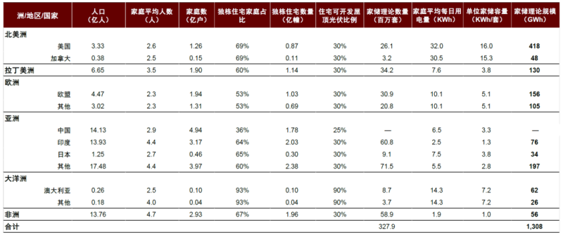 注:家儲(chǔ)在中國(guó)居民側(cè)電價(jià)機(jī)制下經(jīng)濟(jì)差、中國(guó)整縣推進(jìn)模式更適宜集中式儲(chǔ)能,故未測(cè)算中國(guó)理論市場(chǎng)規(guī)模。獨(dú)棟住宅戶占比,拉丁美洲及亞洲其他地區(qū)按照60%、其他地區(qū)按照當(dāng)?shù)貙?shí)際水平分別進(jìn)行測(cè)算;住宅可開發(fā)屋頂光伏比例,澳大利亞按照其實(shí)際水平、其他地區(qū)按照30%分別進(jìn)行測(cè)算;單位家儲(chǔ)容量,按照各地區(qū)戶均每日用電量的50%進(jìn)行測(cè)算。資料來源:NREL,Eurostat,ISF,STATS SA,Worldometer,Statista,中金公司研究部
