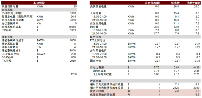 我們測(cè)算美國(guó)加州戶用光伏及儲(chǔ)能的經(jīng)濟(jì)性。我們假設(shè)無光伏/儲(chǔ)能系統(tǒng)地家庭采用單一固定電價(jià),而安裝光伏或光儲(chǔ)系統(tǒng)的家庭采用分時(shí)電價(jià),測(cè)算發(fā)現(xiàn):僅安裝光伏系統(tǒng)投資的回收期約4.6年,光伏+儲(chǔ)能系統(tǒng)投資回收期約5.9年,光儲(chǔ)系統(tǒng)中添加額外的儲(chǔ)能的投資回收期約15.5年, 光伏系統(tǒng)已存在一定經(jīng)濟(jì)性,但戶用儲(chǔ)能系統(tǒng)經(jīng)濟(jì)性尚未具備經(jīng)濟(jì)性。