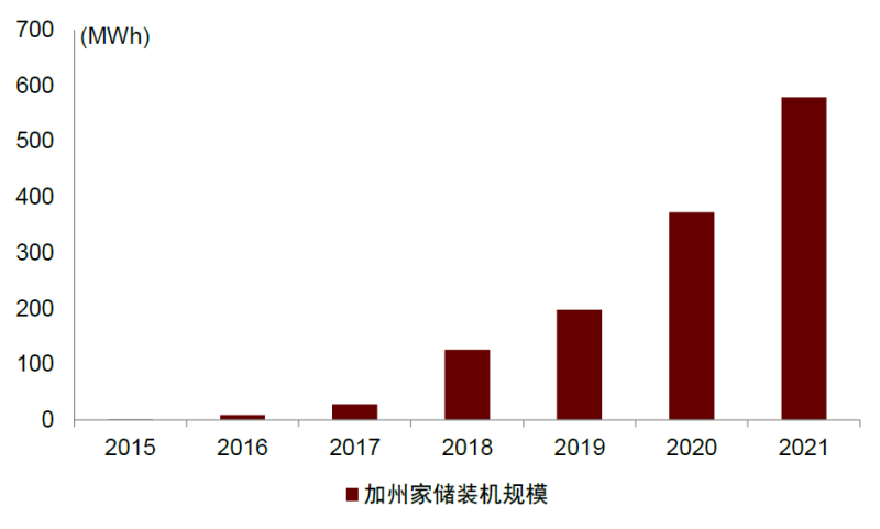 加州擁有全美最大的光伏市場(chǎng),2020年起,加州所有新建的住宅將被要求安裝光伏系統(tǒng),2021年加州戶用光伏裝機(jī)量約1.4GW,同比增長(zhǎng)約32%,戶用儲(chǔ)能裝機(jī)規(guī)模約580MWh,同比增長(zhǎng)55%。