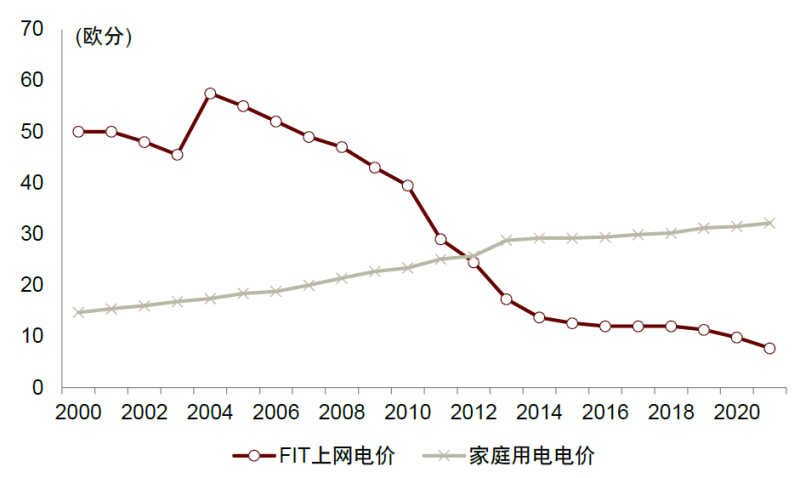 圖表22:德國(guó)FIT上網(wǎng)電價(jià)持續(xù)下降
