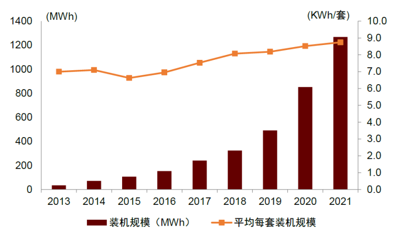 德國(guó)家儲(chǔ)裝機(jī)快速發(fā)展,占儲(chǔ)能裝機(jī)主導(dǎo)地位。根據(jù)德國(guó)亞琛工業(yè)大學(xué)相關(guān)研究數(shù)據(jù),2021年德國(guó)戶用儲(chǔ)能新增套數(shù)約14.5萬套,對(duì)應(yīng)家儲(chǔ)裝機(jī)量約1268 MWh,同比增長(zhǎng)49%,占德國(guó)總儲(chǔ)能裝機(jī)量份額超90%。從家儲(chǔ)單套規(guī)模來看,2021年平均規(guī)模約8.7KWh,近五年持續(xù)提升。