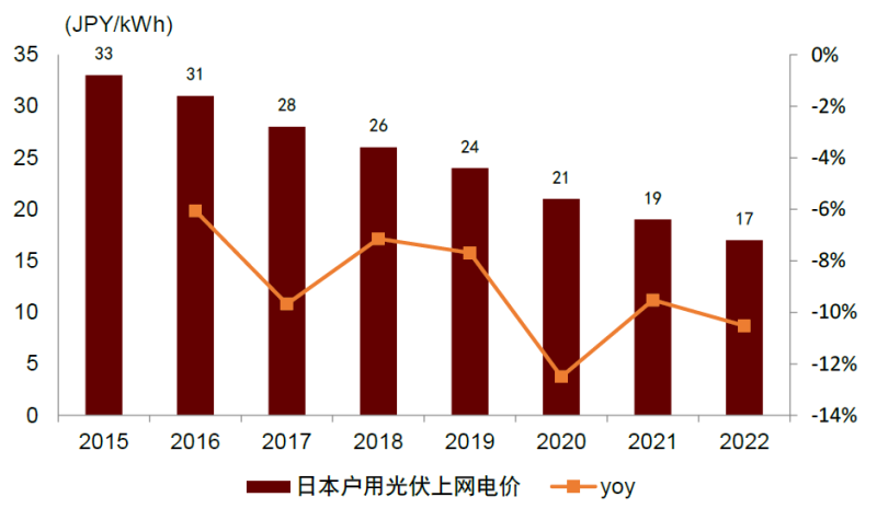 圖表16:日本戶用光伏上網(wǎng)電價(jià)持續(xù)退坡