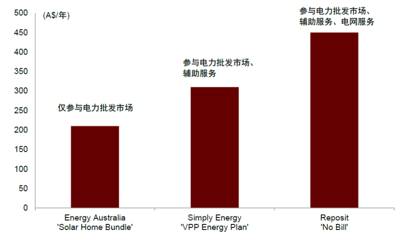 虛擬電廠提供額外收益來源。澳大利亞各州提供眾多虛擬電廠項(xiàng)目,截至2022年4月,澳洲累計(jì)虛擬電廠項(xiàng)目達(dá)61個(gè),其主要技術(shù)為表后儲(chǔ)能,而表后儲(chǔ)能又以家庭儲(chǔ)能為主。澳洲VPP項(xiàng)目通??赏ㄟ^三種方式獲取收益:1)VPP通過電力零售商進(jìn)入電力批發(fā)市場(chǎng);2)提供緊急的需求側(cè)相應(yīng)等電網(wǎng)服務(wù);3)提供輔助服務(wù)。澳洲居民可在安裝家庭光儲(chǔ)系統(tǒng)時(shí)即與系統(tǒng)零售商簽訂VPP項(xiàng)目協(xié)議以換取一定購(gòu)置折扣,或可與獨(dú)立的VPP聚合商簽訂VPP協(xié)議,將儲(chǔ)能系統(tǒng)部分容量參與VPP項(xiàng)目獲取額外收益。如新南威爾士州居民加入不同VPP項(xiàng)目可獲得約200-450澳元/年的額外利益。