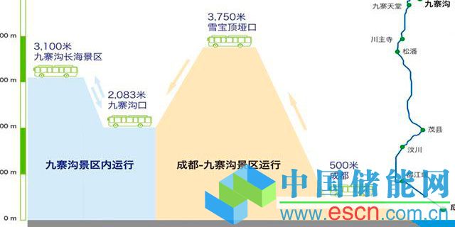 次日,該車在九寨溝景區(qū)內(nèi)再次成功挑戰(zhàn)了高程差達(dá)到1,015米,往返全程104公里的連續(xù)急彎坡道運行的景區(qū)內(nèi)部公交運營線路,其中景區(qū)內(nèi)最高點長海與原始森林景點的海拔達(dá)到了近3,100米。