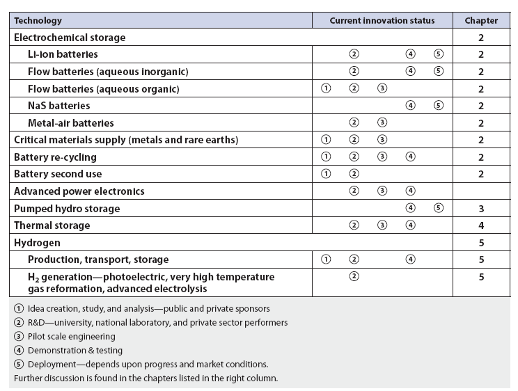 表1 選定儲能技術當前創(chuàng)新狀況調查結果摘要