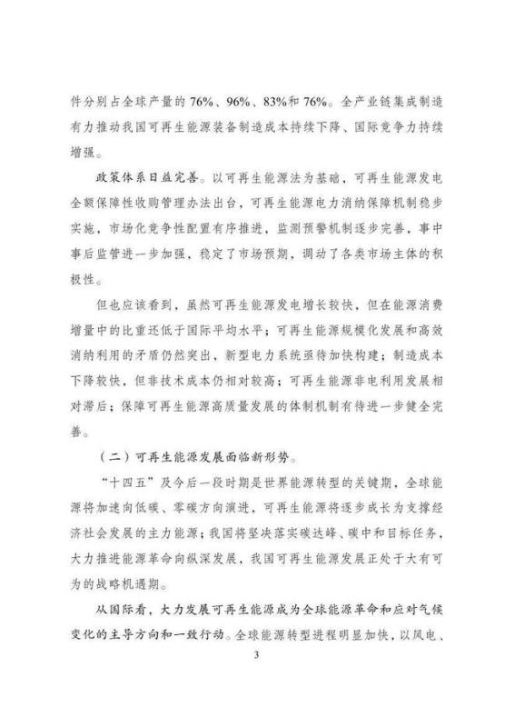 為深入貫徹“四個(gè)革命、一個(gè)合作”能源安全新戰(zhàn)略,落實(shí)碳達(dá)峰、碳中和目標(biāo),推動(dòng)可再生能源產(chǎn)業(yè)高質(zhì)量發(fā)展,根據(jù)《中華人民共和國(guó)國(guó)民經(jīng)濟(jì)和社會(huì)發(fā)展第十四個(gè)五年規(guī)劃和2035年遠(yuǎn)景目標(biāo)綱要》和《“十四五”現(xiàn)代能源體系規(guī)劃》有關(guān)要求,我們組織編制了《“十四五”可再生能源發(fā)展規(guī)劃》?,F(xiàn)印發(fā)給你們,請(qǐng)遵照?qǐng)?zhí)行。