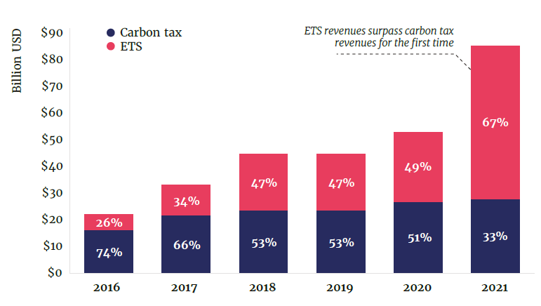 由于碳價的提高,2021年碳收入急劇上升,這也是第一次碳排放交易系統(tǒng)的收入超過了碳稅收入。