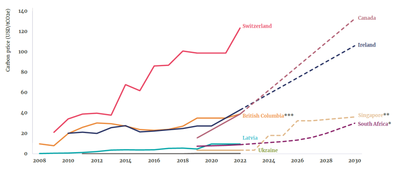 一些國家和地區(qū)在未來幾年制定了更為激進(jìn)的碳定價目標(biāo)。比如,新加坡計(jì)劃將碳稅從目前的每噸二氧化碳排放征收5新加坡元,到2024-2025年,上漲到25新加坡元(相當(dāng)于18美元),2026-2027年,上漲到45新加坡元(相當(dāng)于33美元),2030年上漲到50-80新加坡元(相當(dāng)于37-59美元)。南非也計(jì)劃提高碳稅,從目前每噸二氧化碳排放征收10美元,到2026年提高到20美元,2030年30美元,2050年120美元。加拿大去年也發(fā)布了最新碳價,每噸二氧化碳繳納15加幣(相當(dāng)于12美元),到2030年將提升到170加幣(相當(dāng)于136美元)。由于俄烏戰(zhàn)爭的影響,部分國家也推遲了其碳定價工具的執(zhí)行。比如今年4月,印尼就宣布由于其受到能源上漲的負(fù)面影響,將推遲推行征收碳稅。墨西哥也宣布對汽油和柴油免征碳稅。