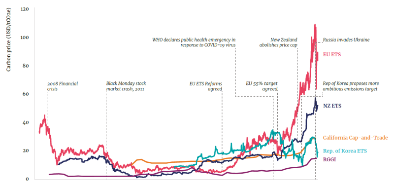 2021年,多個碳排放交易系統(tǒng)的碳定價都達(dá)到歷史新高。歐盟、瑞士、加利福尼亞和魁北克,新西蘭的碳排放交易市場都達(dá)到了歷史最高價,英國價格自2021年年中開始增幅很快,中國市場,2021年末碳價格下跌,但2022年初碳價格有所回升。