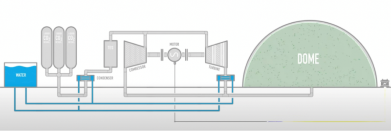 意大利的Energy Dome公司聲稱其研制的二氧化碳電池能提供快速響應(yīng)、廉價(jià)的電網(wǎng)級儲(chǔ)能。其原理類似壓縮空氣儲(chǔ)能系統(tǒng),發(fā)電機(jī)把二氧化碳壓縮成液體并存儲(chǔ),同時(shí)存儲(chǔ)壓縮氣體產(chǎn)生的廢熱;當(dāng)需要支援電網(wǎng)時(shí),便以先前存儲(chǔ)的廢熱將液態(tài)二氧化碳蒸發(fā),驅(qū)動(dòng)第二組渦輪機(jī)發(fā)電,二氧化碳?xì)怏w返回“圓頂”氣囊。