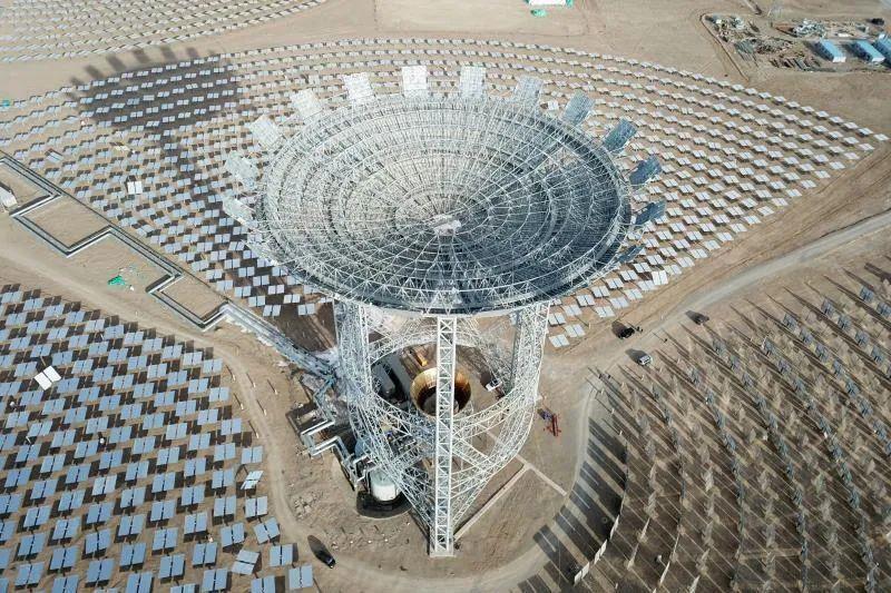 這是首航高科敦煌100兆瓦熔鹽塔式光熱電站,在我國(guó)目前建成規(guī)模最大,其吸熱塔最高,可24小時(shí)連續(xù)發(fā)電。
