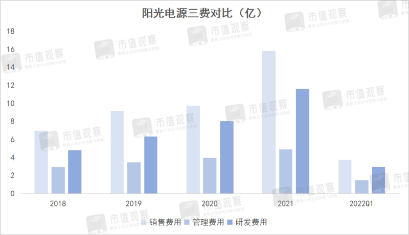 步調(diào)太大典型的就是三費(fèi)。數(shù)據(jù)顯示,2021年陽(yáng)光電源全年銷售費(fèi)用達(dá)15.83億,同比增長(zhǎng)62.69%;研發(fā)費(fèi)用為11.61億,同比增長(zhǎng)44%;管理費(fèi)用4.91億,同比23.99%。