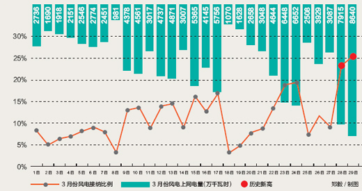 中國儲能網(wǎng)訊:記者日前從內(nèi)蒙古電力集團(tuán)獨家獲悉,3月29日,蒙西地區(qū)風(fēng)電并網(wǎng)電量達(dá)到8640萬千瓦時,占全網(wǎng)比重為25.4%,電量比例繼去年10月15日創(chuàng)造24%高峰后再創(chuàng)新高,全天電網(wǎng)安全穩(wěn)定運行。據(jù)悉,內(nèi)蒙古采暖期到4月15日結(jié)束,蒙西電網(wǎng)在保證采暖的基礎(chǔ)上全力接納風(fēng)電并網(wǎng),現(xiàn)供熱機(jī)組出力平均為70%。3月29日,風(fēng)電最大出力也創(chuàng)下歷史新高,達(dá)503萬千瓦。3月30日,內(nèi)蒙古電力集團(tuán)人士在截稿前預(yù)計,當(dāng)日風(fēng)電并網(wǎng)電量有望超過9000萬千瓦時,占全網(wǎng)上網(wǎng)電量比率將超26%,繼續(xù)刷新紀(jì)錄。