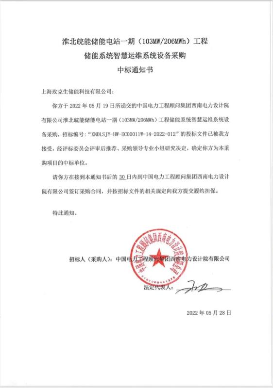 儲(chǔ)能系統(tǒng)智慧運(yùn)維系統(tǒng)設(shè)備采購(gòu)中標(biāo)通知書(shū)