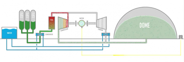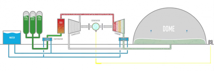 Energy Dome的電池使用巨大的穹頂,其中有巨大的、靈活的囊袋,里面充滿了二氧化碳氣體。它通過使用能量來運行電動壓縮機,將氣體擠壓成越來越小的體積,最終將其冷凝成液體,在環(huán)境溫度下儲存,從而為電池“充電”。這個充電過程產(chǎn)生廢熱,并被收集到熱能儲存系統(tǒng)中。