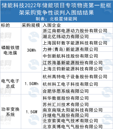 公告顯示,3GWh磷酸鐵鋰電池簇入圍供應(yīng)商包含南都、億緯、國軒、力神、中創(chuàng)新航、?;?、上海蘭鈞等7家企業(yè),1.5GWh電氣電子總成入圍供應(yīng)商包含高特、杭州科工、合肥華思等3家企業(yè),1.5GW功率變換系統(tǒng)入圍供應(yīng)商包含科華、匯川、南瑞、許繼、索英、英博等6家企業(yè)。