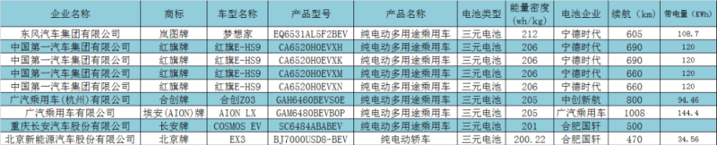 高工鋰電梳理2021-2022年已發(fā)布的《新能源汽車推廣應(yīng)用推薦車型目錄》發(fā)現(xiàn),目前已有東風(fēng)、一汽、廣汽、長安、北汽等多家主機廠申報了搭載系統(tǒng)能量密度超過200Wh/kg的純電動車型,配套電池企業(yè)為寧德時代、中創(chuàng)新航和國軒高科。