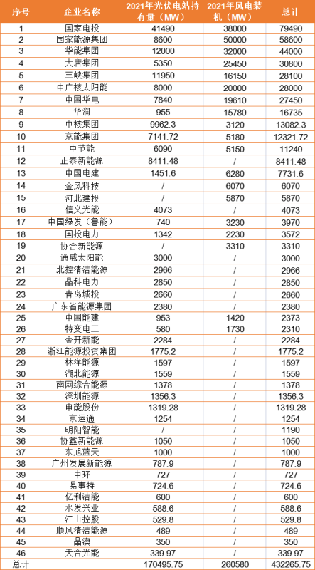 作為風(fēng)電、火電領(lǐng)域的“巨無霸”,國家能源集團(tuán)是2021年光伏電站增幅最高的企業(yè),年度光伏電站新增規(guī)模近7GW,其在光伏領(lǐng)域的投資力度正持續(xù)增強(qiáng)。事實(shí)上,國家能源集團(tuán)在光伏領(lǐng)域投資啟動(dòng)較晚,過去兩年,國家能源集團(tuán)光伏總裝機(jī)不足2GW。但隨著“雙碳目標(biāo)”的提出,國家能源集團(tuán)提出了“十四五”期間50GW的光伏新增規(guī)劃,年新增規(guī)模10GW/年。去年,國家能源集團(tuán)發(fā)力光伏投資開發(fā),鎖定風(fēng)光大基地13.9GW,整縣光伏開發(fā)提出了到今年不低于500縣的要求。近日,國家能源集團(tuán)舉行了2022年電力項(xiàng)目開工儀式,預(yù)計(jì)其今年新能源開工超過20GW、投產(chǎn)15GW。