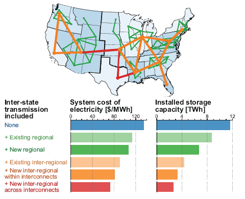 由于擴(kuò)大的輸電容量部分替代了部署的儲(chǔ)能系統(tǒng),因此增加的輸電和更大的區(qū)域協(xié)調(diào)(輸電擴(kuò)展有效地增加了調(diào)度區(qū)域的地理范圍)導(dǎo)致儲(chǔ)能部署裝機(jī)容量的下降。在電網(wǎng)互連程度最高的場(chǎng)景(“新區(qū)域間互聯(lián)輸電”)部署了“新區(qū)域”輸電場(chǎng)景中使用的40%的儲(chǔ)能系統(tǒng)和“孤立州”場(chǎng)景中使用的23%的儲(chǔ)能系統(tǒng)。