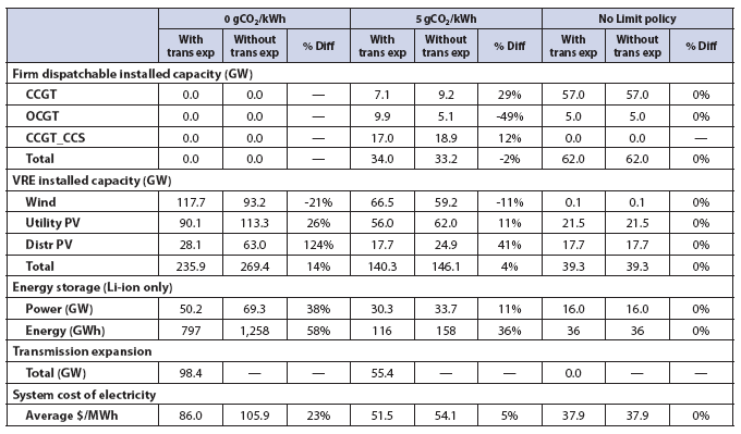在該模型中,增加區(qū)域輸電容量提供了兩個(gè)主要好處:(1)它允許在具有更高質(zhì)量的可再生能源(更低的能源成本)在地區(qū)增加部署,從而降低整體系統(tǒng)成本;(2)它通過平衡連接區(qū)域之間的資源間歇性和減少地理差異的影響來改善可再生能源發(fā)電。因此,將輸電容量的最佳部署限制在這些地區(qū)目前存在的水平上,將可再生能源部署集中在與服務(wù)需求相同的區(qū)域,而不是允許部署在具有最高質(zhì)量資源的站點(diǎn)。例如表6.13顯示,對(duì)于美國(guó)東北部地區(qū),在允許區(qū)域內(nèi)輸電擴(kuò)展的5gCO2/kWh情況下,該模型通過在區(qū)域內(nèi)增加55GW的新輸電容量來連接來自其他區(qū)域的更優(yōu)質(zhì)的可再生能源資源進(jìn)行優(yōu)化。