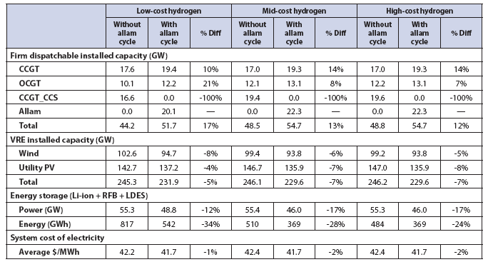 如果Allam循環(huán)技術(shù)(這是一種將煤氣化技術(shù)和Allam循環(huán)相結(jié)合的先進(jìn)動(dòng)力系統(tǒng))實(shí)現(xiàn)商業(yè)化,研究團(tuán)隊(duì)的模型預(yù)測(cè)它將主導(dǎo)德克薩斯州的燃?xì)廨啓C(jī)聯(lián)合循環(huán) (CCGT)+碳捕獲和儲(chǔ)存(CCS)部署。與該技術(shù)不可用的情況相比,在德克薩斯州的中等成本氫氣的情況下,在5gCO2/kWh的情況下,部署Allam循環(huán)的選項(xiàng)可將天然氣發(fā)電設(shè)備的總裝機(jī)容量增加13%,并將儲(chǔ)能容量減少7%(表6.12)。Allam循環(huán)可以作為儲(chǔ)能系統(tǒng)的部分替代品,如采用儲(chǔ)氫形式的長(zhǎng)時(shí)儲(chǔ)能系統(tǒng)模型可交付儲(chǔ)能容量減少28%,采用金屬-空氣電池儲(chǔ)能系統(tǒng)的長(zhǎng)時(shí)儲(chǔ)能系統(tǒng)模型使儲(chǔ)能容量減少20%,以及3%以儲(chǔ)熱形式使用長(zhǎng)時(shí)儲(chǔ)能系統(tǒng)。表6.12記錄了在不同成本假設(shè)下,通過將Allam循環(huán)添加到具有儲(chǔ)氫的電力系統(tǒng)中獲得的增量系統(tǒng)平均電力成本(SCOE)有所減少??偟膩碚f,在5gCO2/kWh排放政策案例下,所有三種長(zhǎng)時(shí)儲(chǔ)能系統(tǒng)技術(shù)的低、中、高成本假設(shè)下,Allam循環(huán)與長(zhǎng)時(shí)儲(chǔ)能系統(tǒng)的可用性相對(duì)于基本案例的系統(tǒng)平均電力成本(SCOE)降低了5%~13% 。