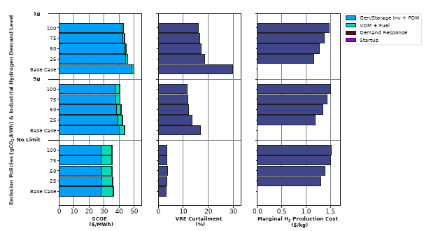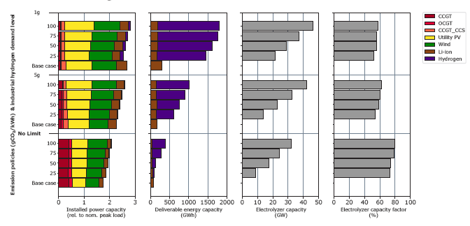 研究團(tuán)隊(duì)評(píng)估了不同碳排放限制下不同水平的氫氣需求對(duì)電力系統(tǒng)結(jié)果的影響,重點(diǎn)關(guān)注德克薩斯州,因?yàn)樗敲绹?guó)能源消耗最大的州之一,并且一半以上的能源消耗來自該州的工業(yè)生產(chǎn)設(shè)施。研究團(tuán)隊(duì)模擬的工業(yè)氫氣需求情景是通過假設(shè)該部門采用氫氣來替代過程加熱中使用的天然氣來開發(fā)的。研究團(tuán)隊(duì)根據(jù)工業(yè)應(yīng)用中作為熱源的天然氣的不同氫氣替代水平考慮了一系列情景:0%、25%、50%、75%和100%。這里100%的替代對(duì)應(yīng)于19.7GW的氫氣需求,0%的情況對(duì)應(yīng)于沒有氫氣需求。