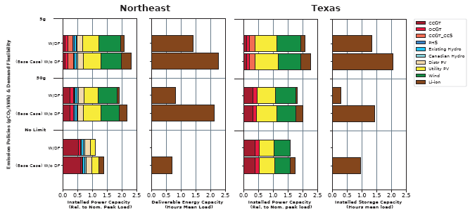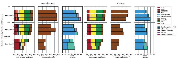 圖6.15 美國(guó)東北部和德克薩斯州地區(qū)在一系列碳排放限制條件下,靈活性需求對(duì)裝機(jī)容量、儲(chǔ)能容量和系統(tǒng)平均電力成本(SCOE)的影響