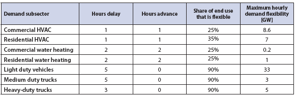 研究團(tuán)隊(duì)關(guān)于需求靈活性的假設(shè)基于美國(guó)國(guó)家可再生能源實(shí)驗(yàn)室(NREL)的電氣化未來研究 (EFS)的增強(qiáng)靈活性情景,該情景為特定需求子行業(yè)提供了潛在的延遲和提前時(shí)間以及可以轉(zhuǎn)移的負(fù)載份額。由于每個(gè)子行業(yè)的負(fù)載隨時(shí)間而變化,潛在的需求靈活性也因時(shí)間的推移而有所不同。出于這個(gè)原因,表6.11指出了在高電氣化負(fù)載情景下,德克薩斯地區(qū)在2050年的任何時(shí)間點(diǎn)每個(gè)子行業(yè)可能轉(zhuǎn)移的最大負(fù)載。重要的是要注意這些子部門的峰值需求不會(huì)同時(shí)出現(xiàn)。