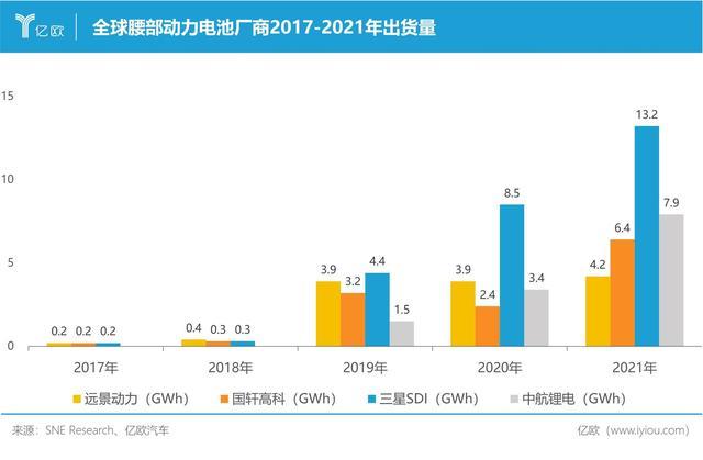 快速成長(zhǎng)的企業(yè)中,中國(guó)動(dòng)力電池企業(yè)占據(jù)大半江山,以遠(yuǎn)景動(dòng)力、國(guó)軒高科、中航鋰電等為代表的廠商,在五年內(nèi)實(shí)現(xiàn)了10倍以上漲幅。而三星SDI則在全球腰部企業(yè)中一路領(lǐng)跑,2021年出貨量突破10GWh。