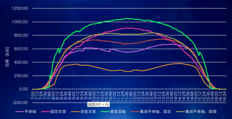 此外,根據(jù)系統(tǒng)實(shí)證數(shù)據(jù),還發(fā)現(xiàn)不同支架類型組合方案的運(yùn)行出力曲線各不相同,其中,以固定支架為主的組合方案曲線為單峰拋物線型曲線;以平單軸為主的跟蹤支架出力曲線為雙峰馬鞍型曲線,與固定支架峰值出現(xiàn)的時(shí)間不同;以雙軸為主的跟蹤支架出力曲線為扁平拋物線型曲線,與固定支架相比較,發(fā)電量高20%左右,最大峰值功率高15%同一子陣集成不同類型支架為扁平單峰拋物線型曲線或扁平雙峰馬鞍型曲線,與固定支架相比較,發(fā)電量高3%左右,最大峰值功率低9%。